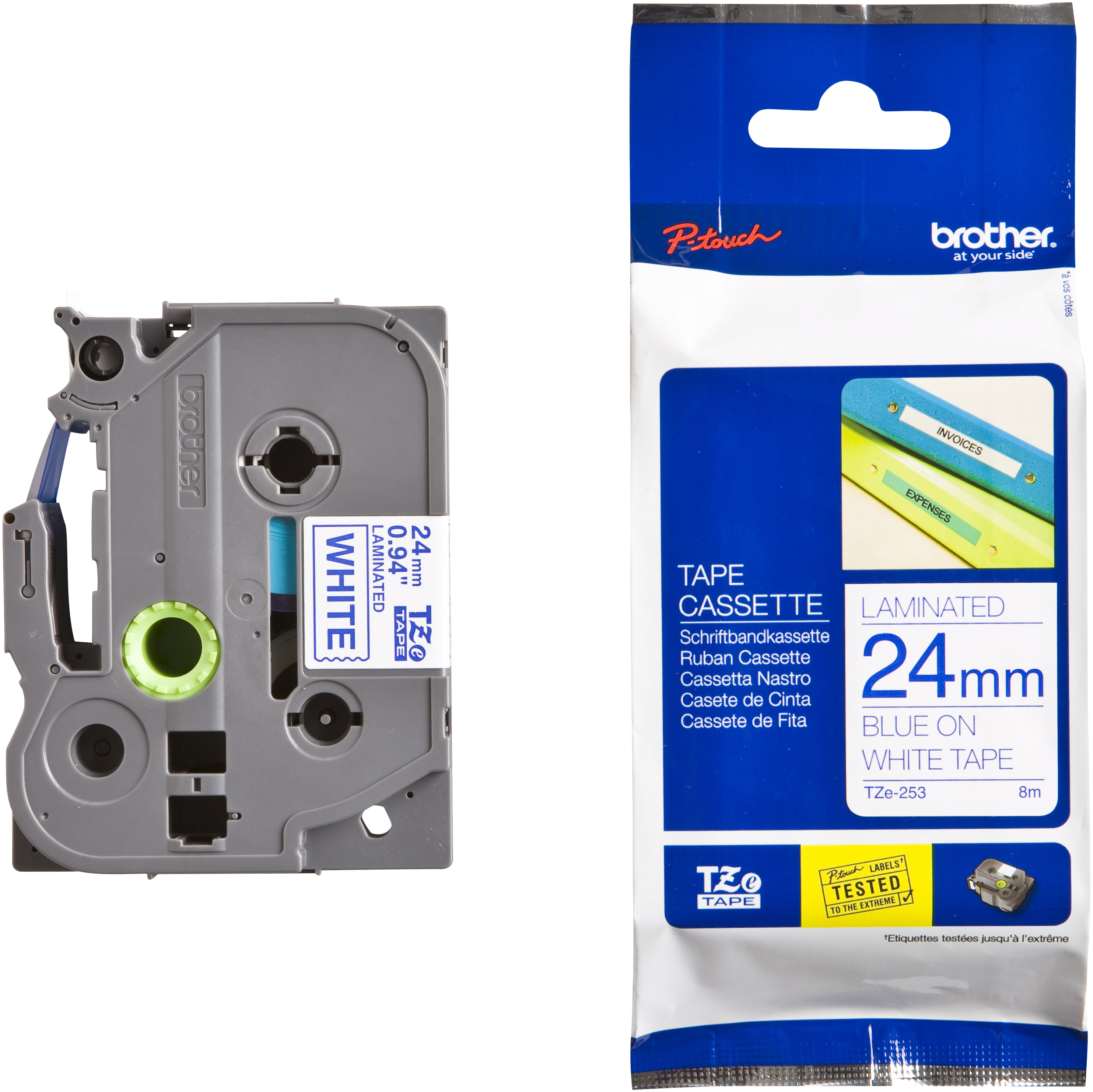 Brother prægetape TZE253, 24 mm blå på hvid tape