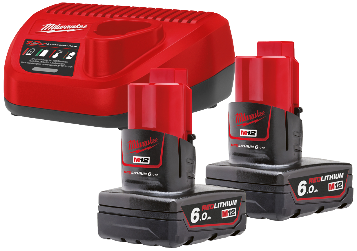 Milwaukee 2 stk 6 amp batt. + lader, M12 NRG-602